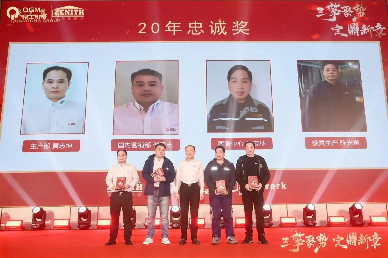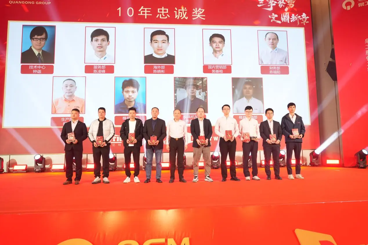Во время ежегодного собрания также была проведена торжественная церемония награждения премий за 10-летнюю, 20-летнюю и 30-летнюю лояльность. Группа сотрудников, которые шли рука об руку с компанией и росли вместе, вышла на сцену, полностью продемонстрировав прочную основу устойчивого развития Quangong Machinery Co., Ltd. и ее устойчивую корпоративную культуру.